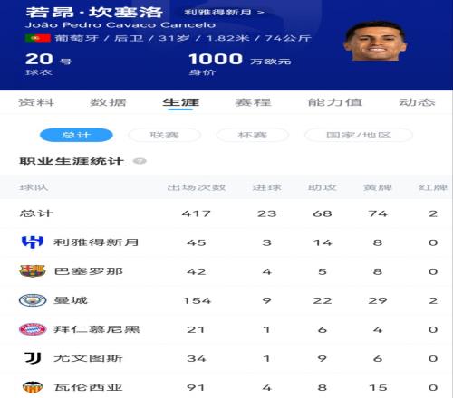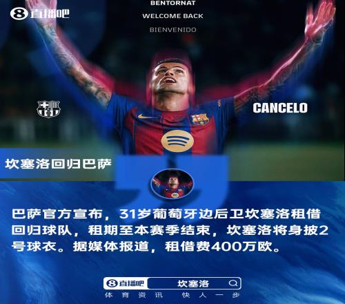 31岁的坎塞洛2024年夏窗以2500万欧元价格从曼城加盟利雅得新月,此前他曾于2023年租借效力过巴萨一年。