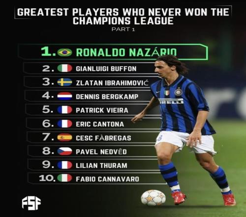 从未赢得欧冠冠军的最伟大球员榜单发布!大罗高居第一伊布上榜