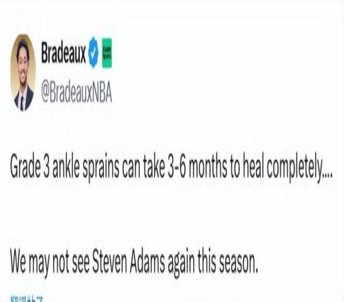 火箭遭重创!亚当斯脚踝三级扭伤将无限期缺阵可能会赛季报销